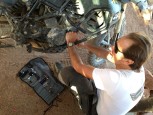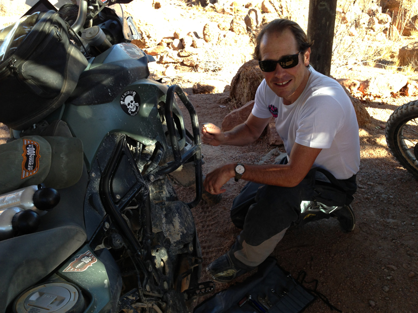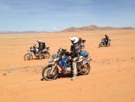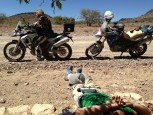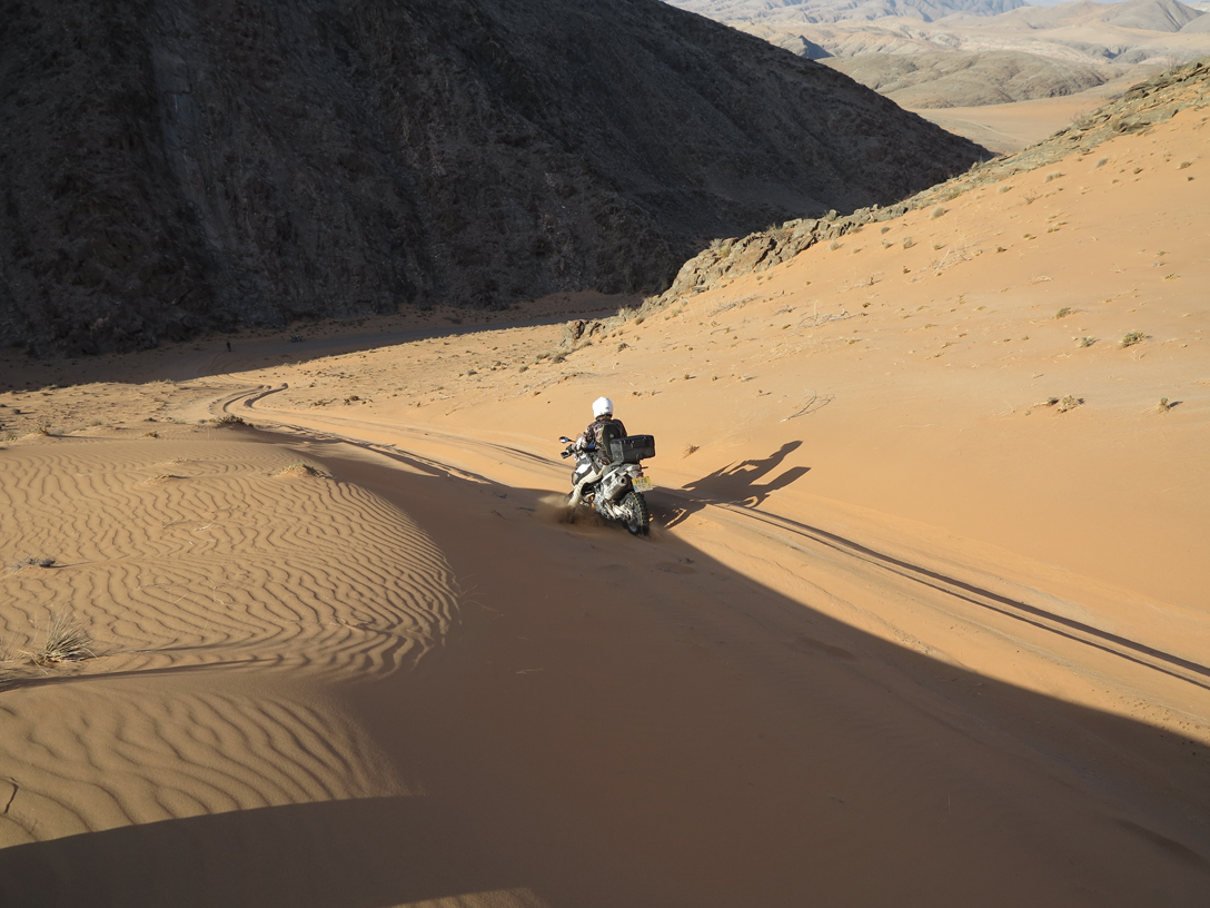 Having ridden well over 200ks completely off road, we were within 20km of the camp and what promised to be the most refreshing G and T of the tour (for some reason G and T just tastes better in the desert) when we encountered the driest, deepest, softest sand so far. To make things worse we were now in a conservation zone, so riding off the road was strictly prohibited, meaning that we had to negotiate cavernous ruts in this already impossible sand. After a few hours of struggle, frustration and seriously cardiovascular work we thought we had cracked it only to be faced with the decent of a 200 meter, treacherously steep sand dune. Gregg nobly went first and made it look easy so the rest of us cartwheeled down behind him. At the bottom his trusty 650 gave up the ghost and had to be abandoned in the sand. The final kilometre to the camp seemed to go on forever. Now completely shattered I clocked up five ‘offs’ in 50 meters. It was a truly adventurous days motorcycling.
