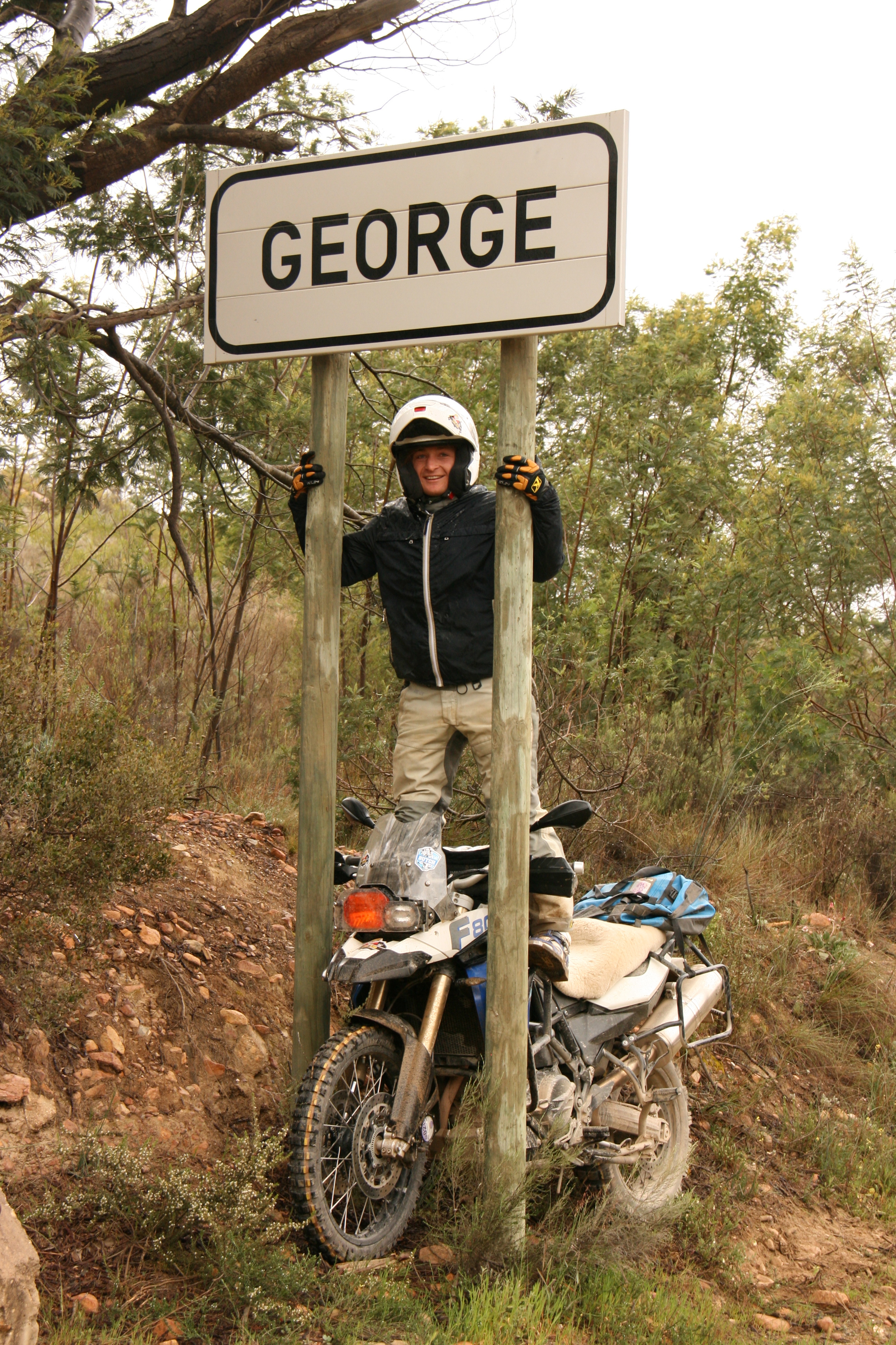 We had our second moderately serious tumble on the way down. Gregg came to rest in a rocky ditch and was grateful for his protective gear. The bike now would not look out of place in Mad Max!